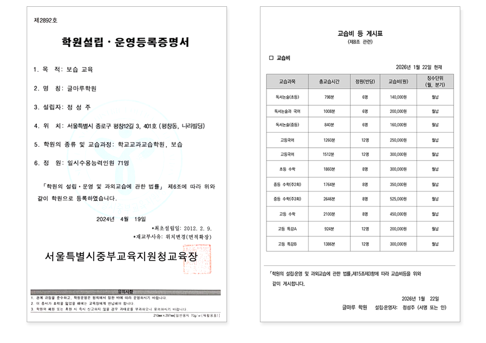 학원 설립 운영 등록 · 교습비 게시표